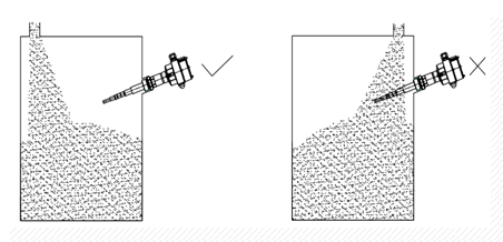 在選擇射頻導納料位開關安裝位置時,應避免由于安裝在入料口位置而造成的測量誤差,甚至損壞儀表(見圖)