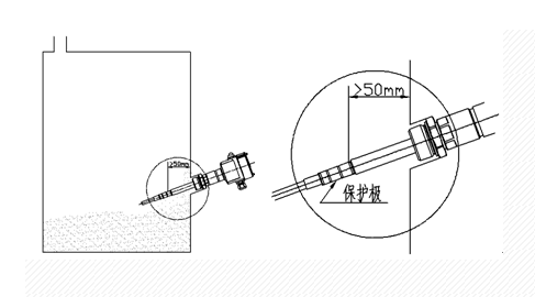 為保證儀表抗粘附的功能,儀表安裝時應保證探頭保護極插入料倉內的尺寸大于50mm(見圖)
